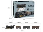 | W zestawie: elementy toru, lokomotywa, 3 wagony towarowe, 2 drzewka, pozostałe akcesoria |